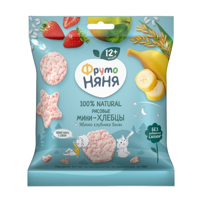 ФРУТО НЯНЯ Мини-хлебцы рисовые с яблоком клубникой бананом и пребиотиком с 12 месяцев 30 г